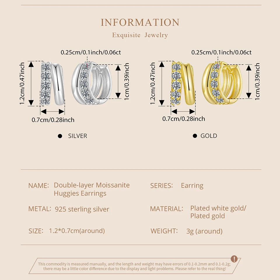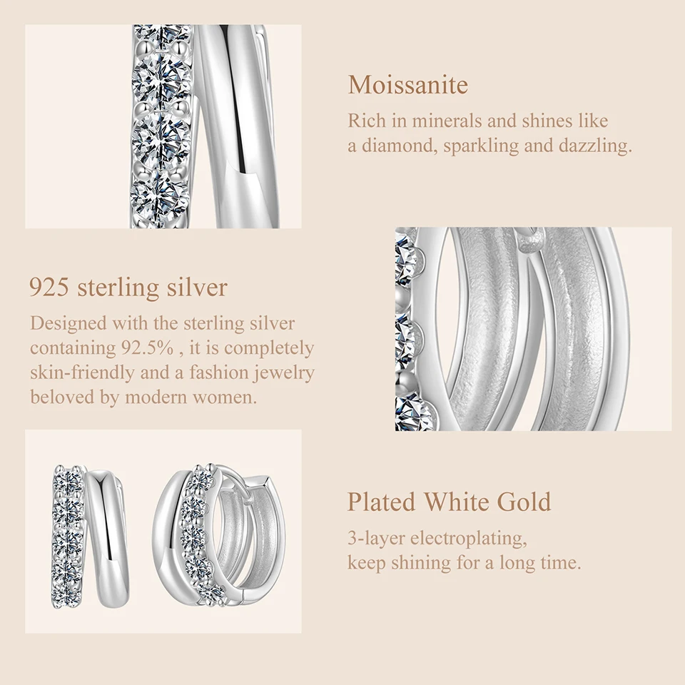 Manova Store presents the BAMOER 0.3CT Double-layer Moissanite Huggies Earrings, a sparkling addition to any jewelry collection. Crafted from 100% 925 sterling silver with a white gold plating, these hoop earrings offer a luxurious shine while remaining lightweight and comfortable at just 3g.