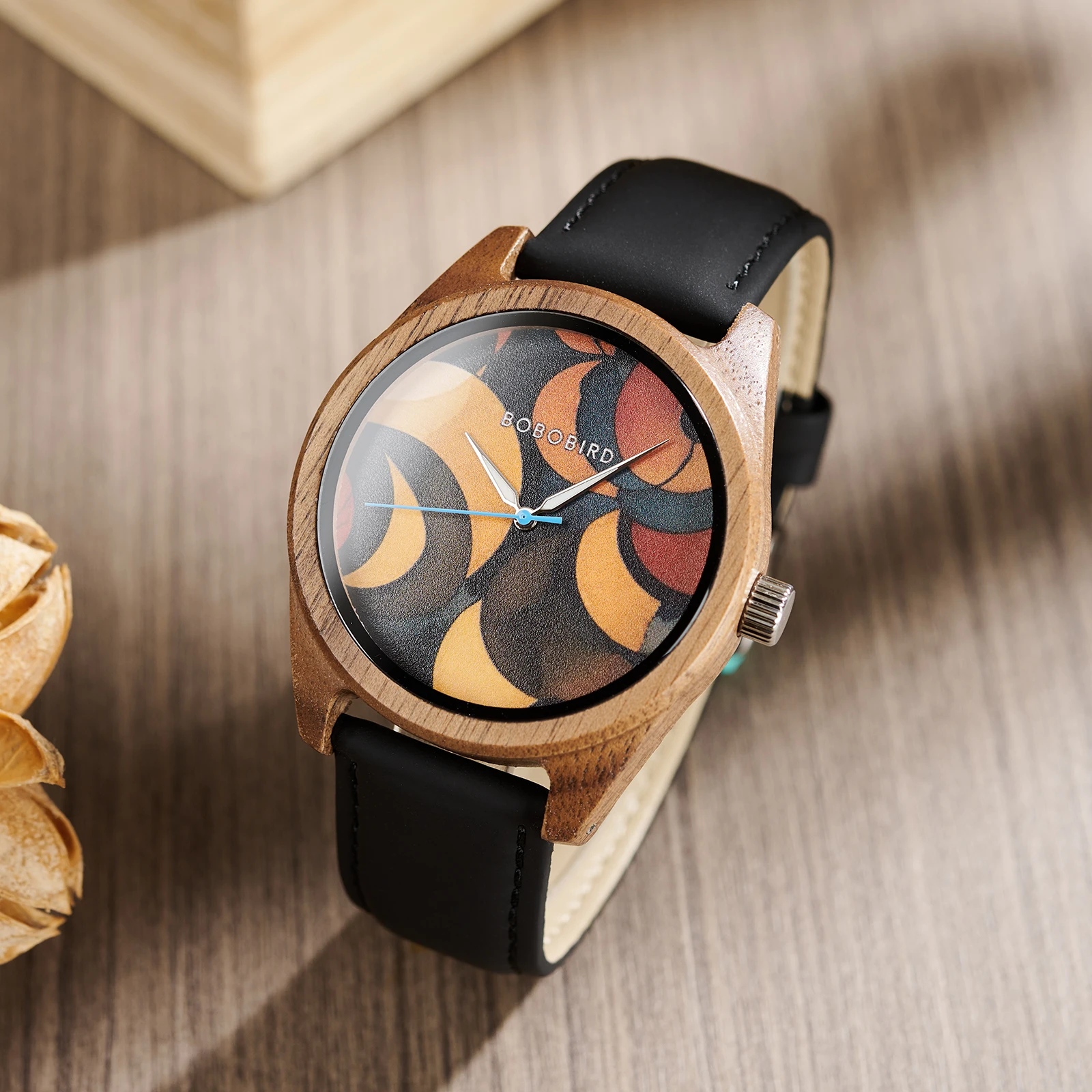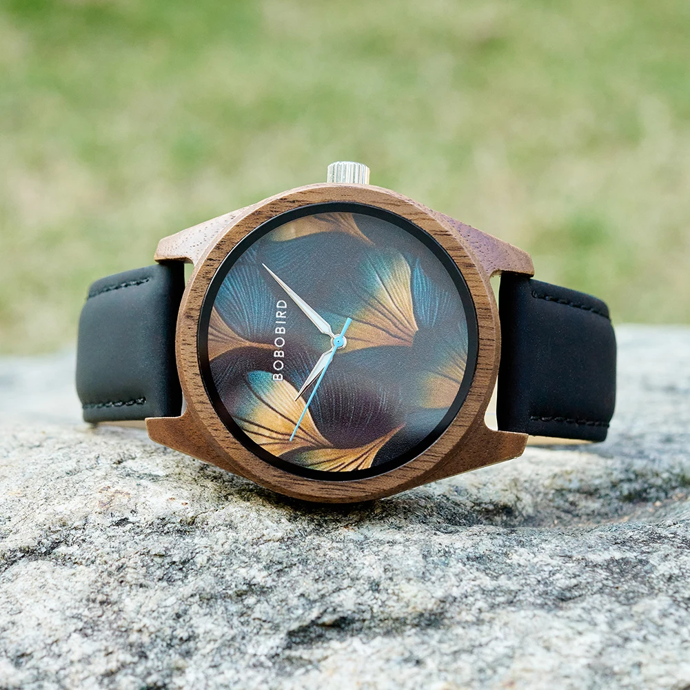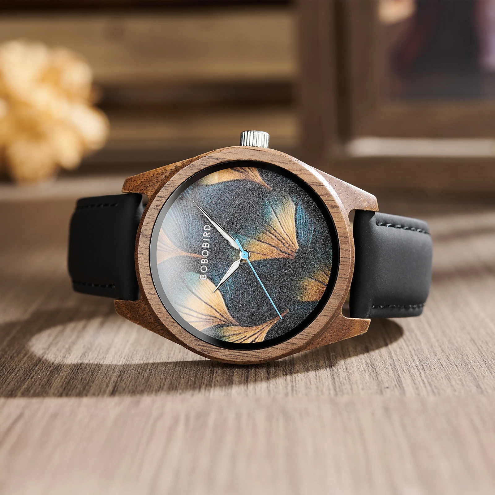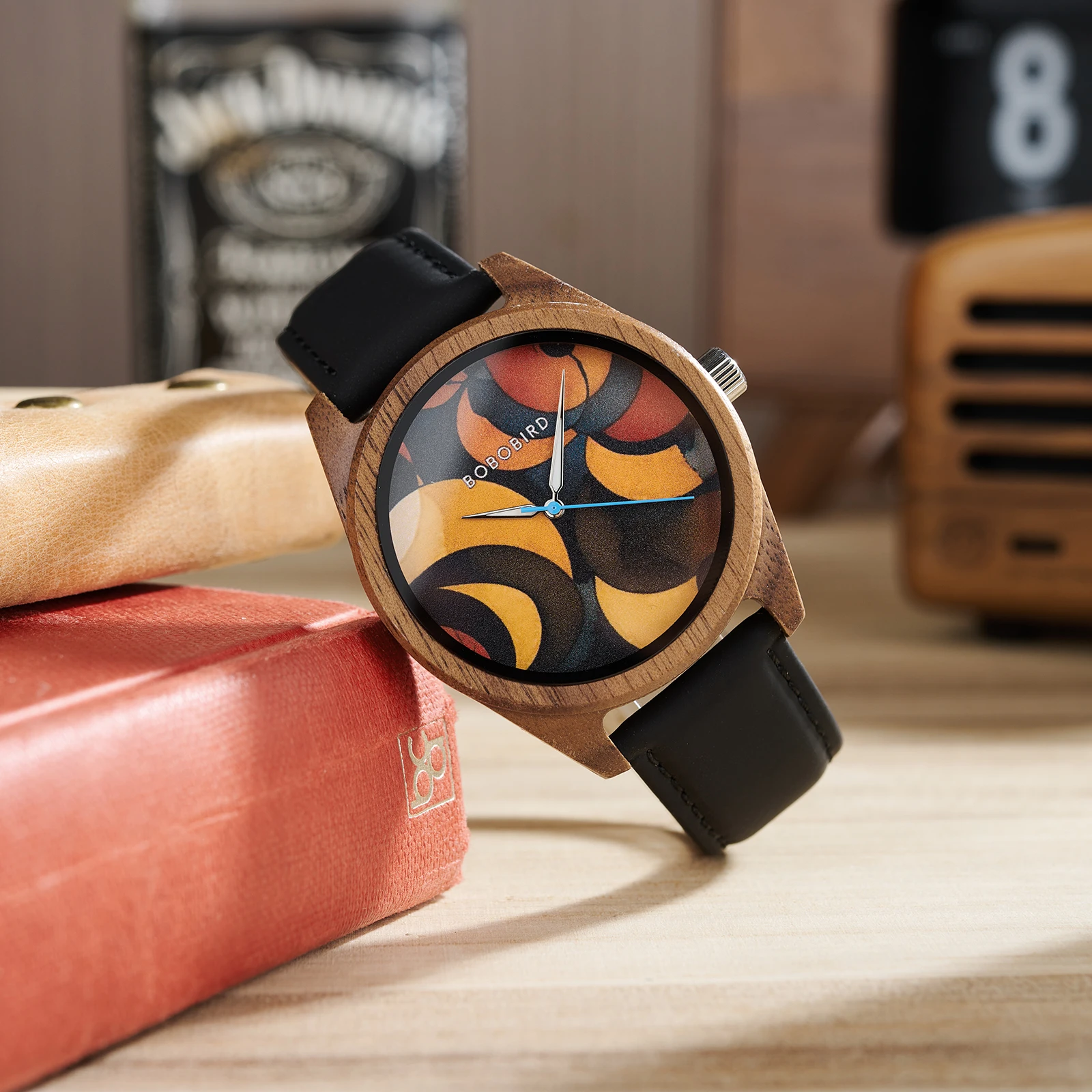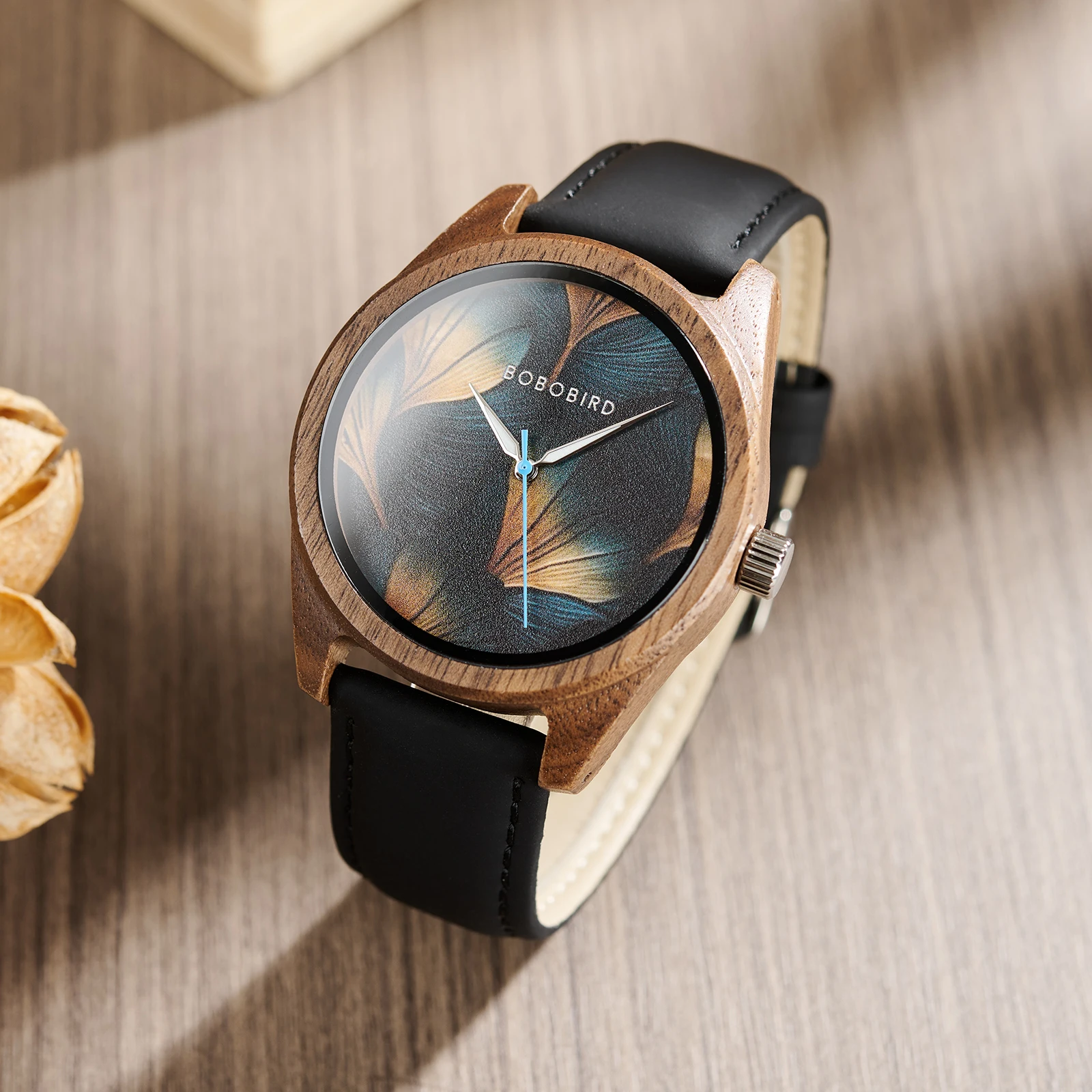 This wooden watch features a natural wooden case paired with a black leather strap, blending modern art. With its unique material, personalized abstract pattern design, versatile practicality, and brand effect, it becomes a personalized choice that combines fashion and nature.