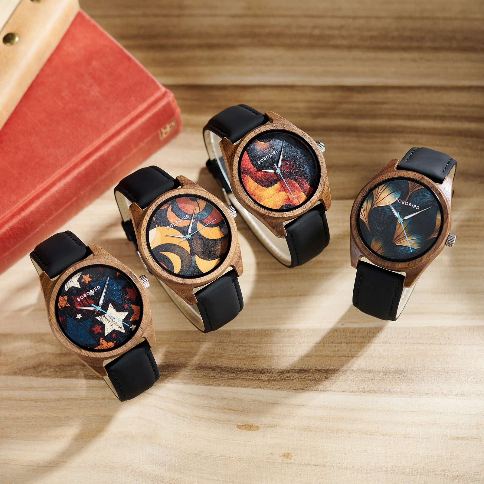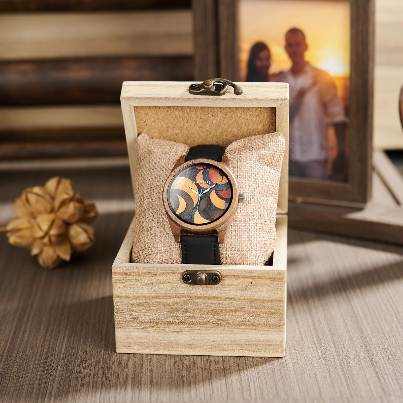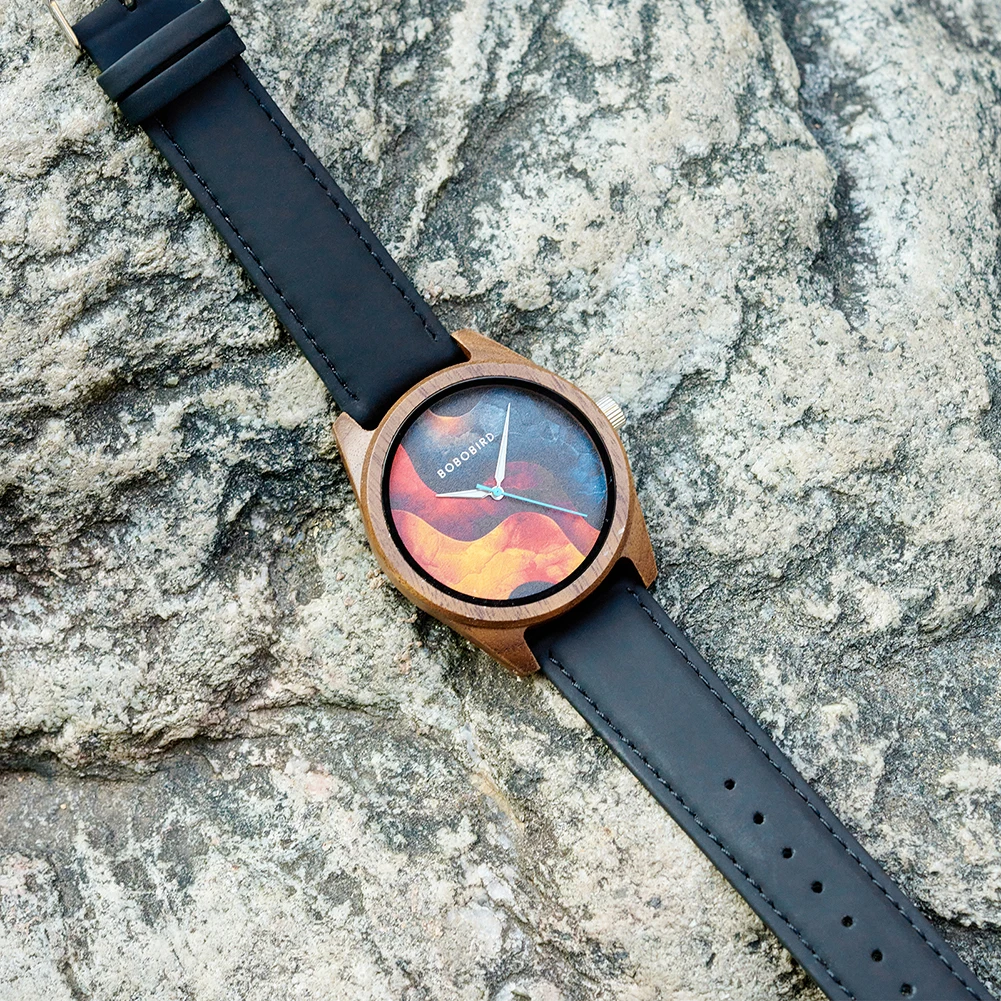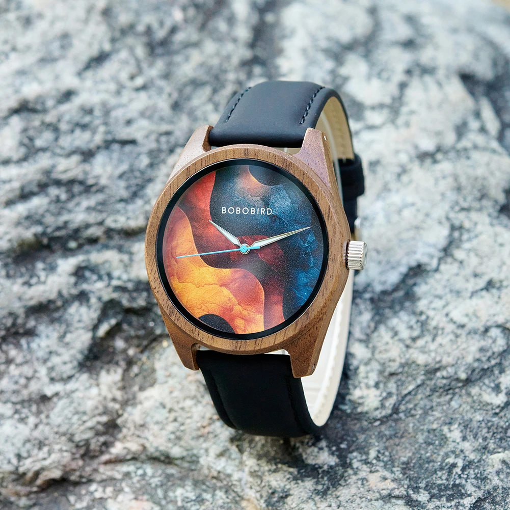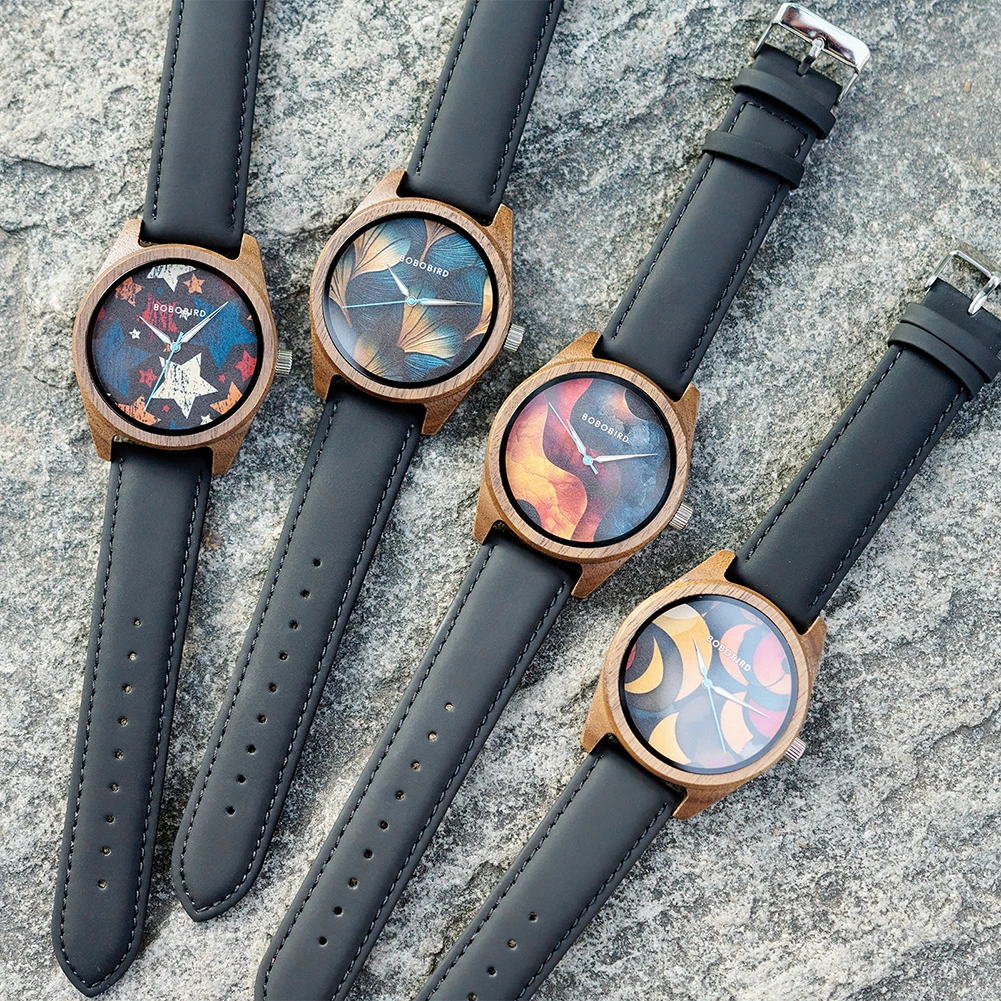 This wooden watch features a natural wooden case paired with a black leather strap, blending modern art. With its unique material, personalized abstract pattern design, versatile practicality, and brand effect, it becomes a personalized choice that combines fashion and nature.