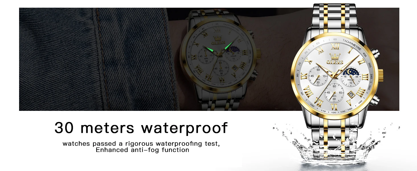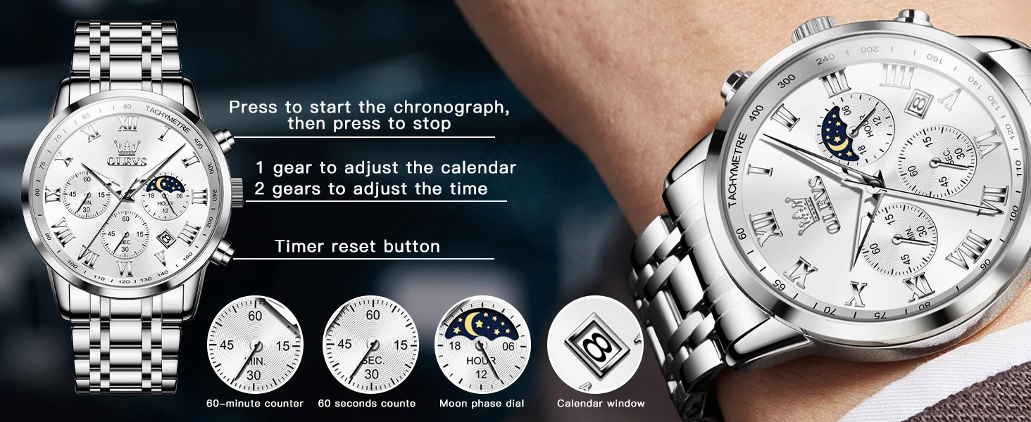 Upgrade your style with the OLEVS 5529 Men’s Multifunction Quartz Watch from MANOVA STORE. Featuring a durable stainless steel case and band, this watch combines fashion and functionality with luminous hands, a moon phase display, and a precise chronograph quartz movement.