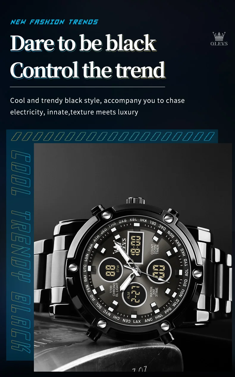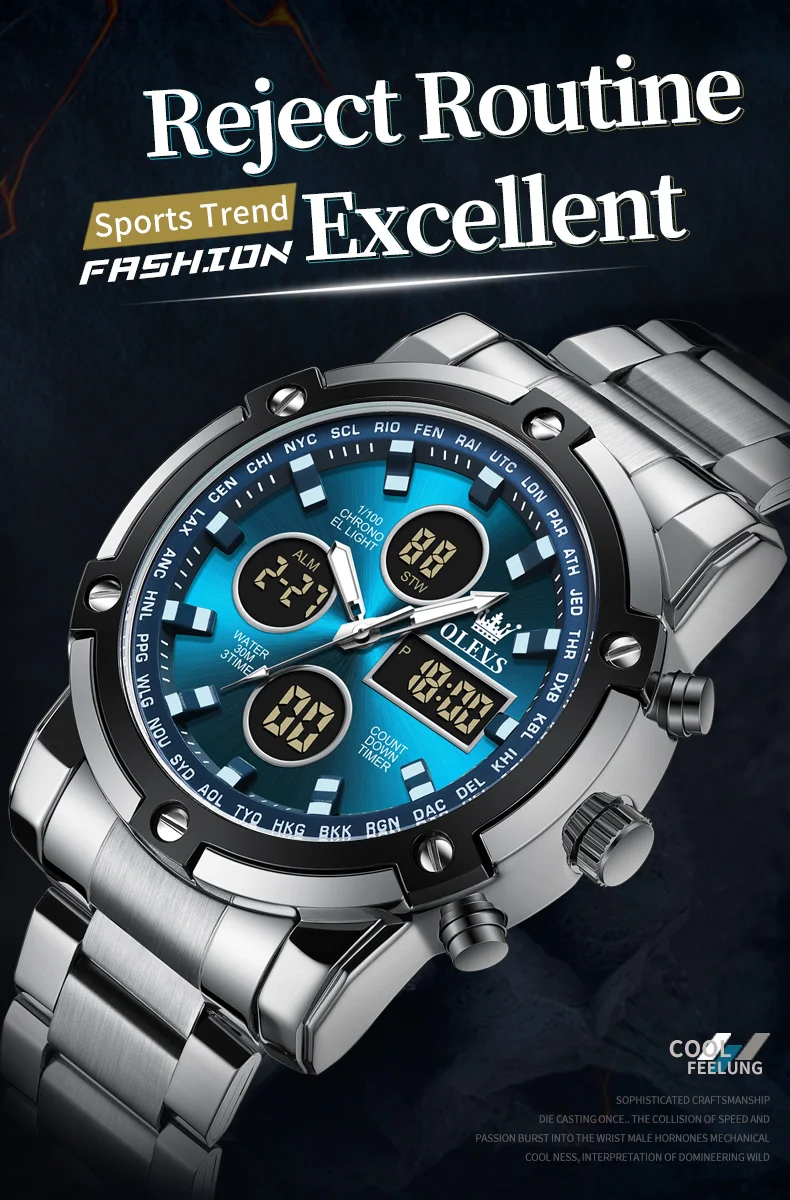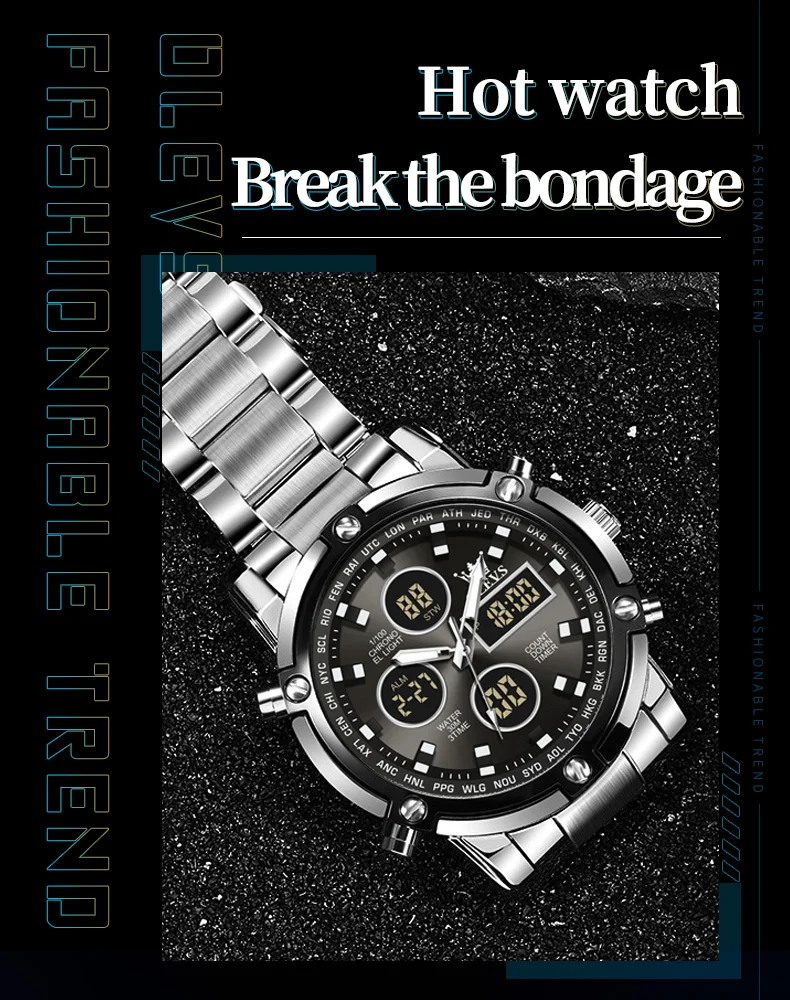 OLEVS Men’s LED Display Watch – Stainless Steel, Waterproof, Quartz, Trendy Sports & Fashion Design