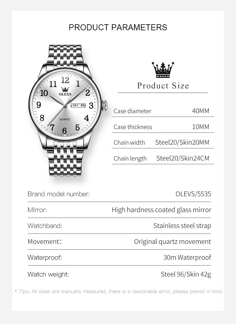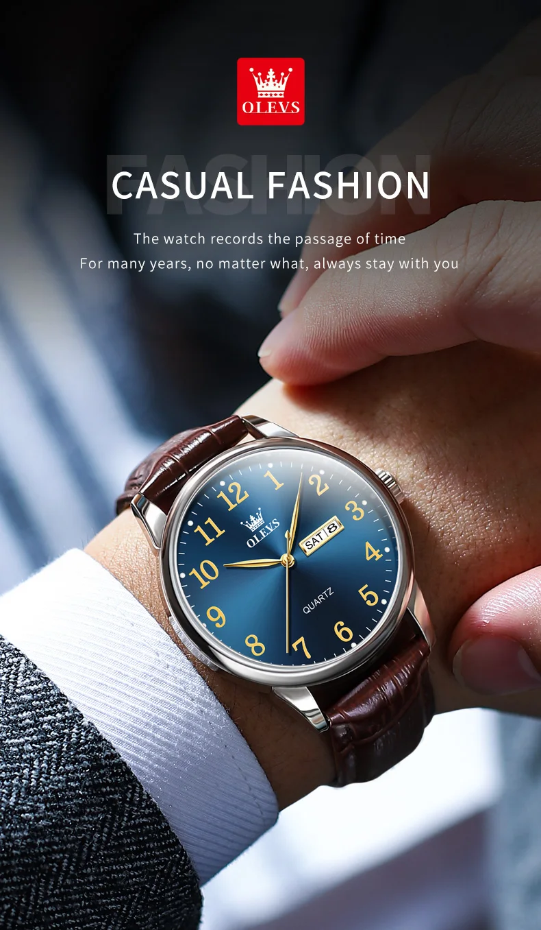 Designed to be shock-resistant and water-resistant up to 3 Bar, this lightweight timepiece (42g for leather, 96g for stainless steel) is built for durability and everyday wear. The OLEVS 5535 is a refined accessory that blends elegance, reliability, and modern fashion for the contemporary man.
