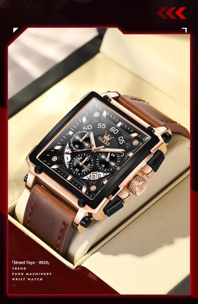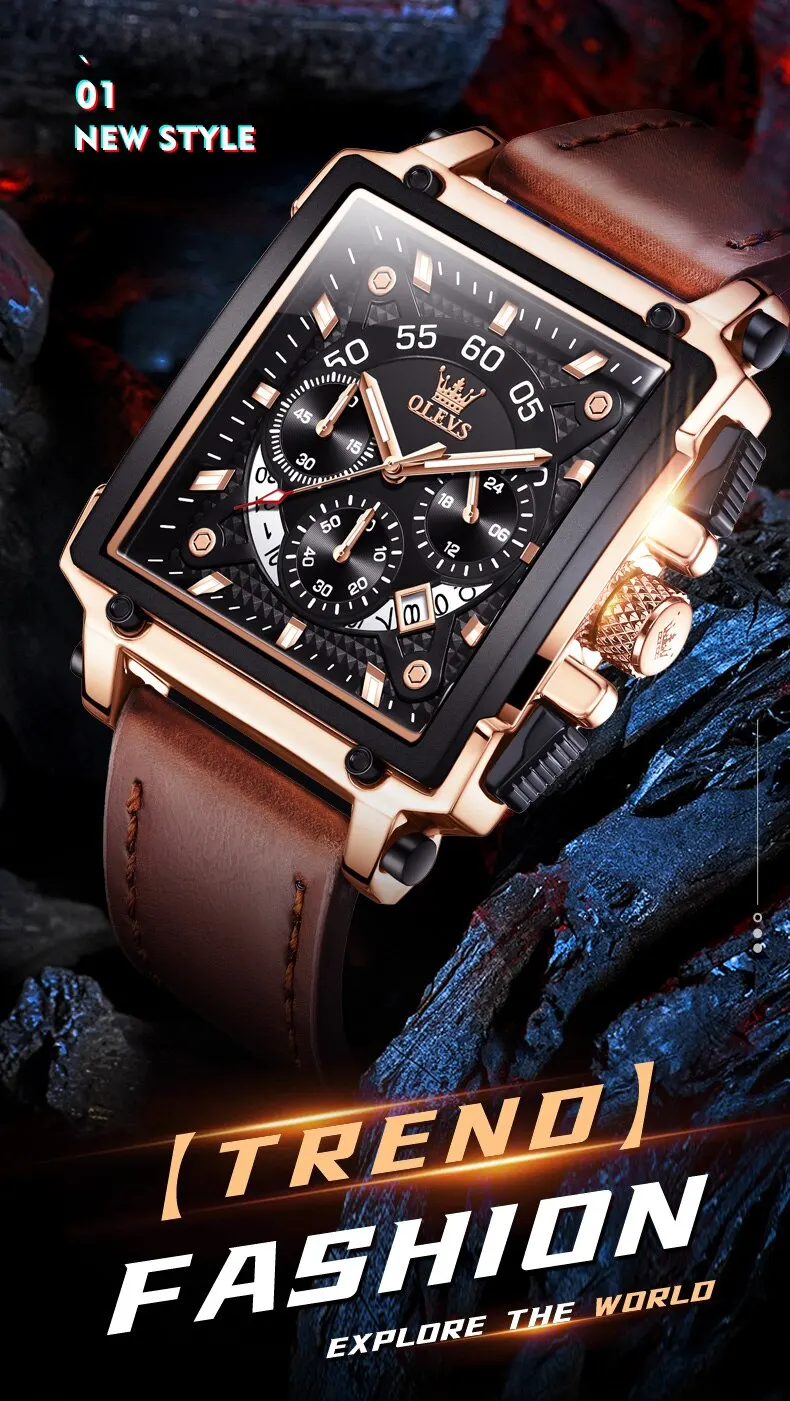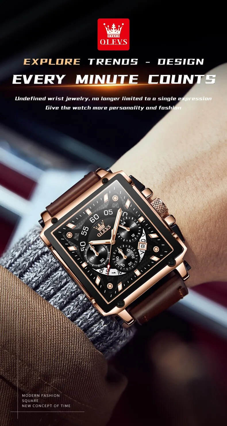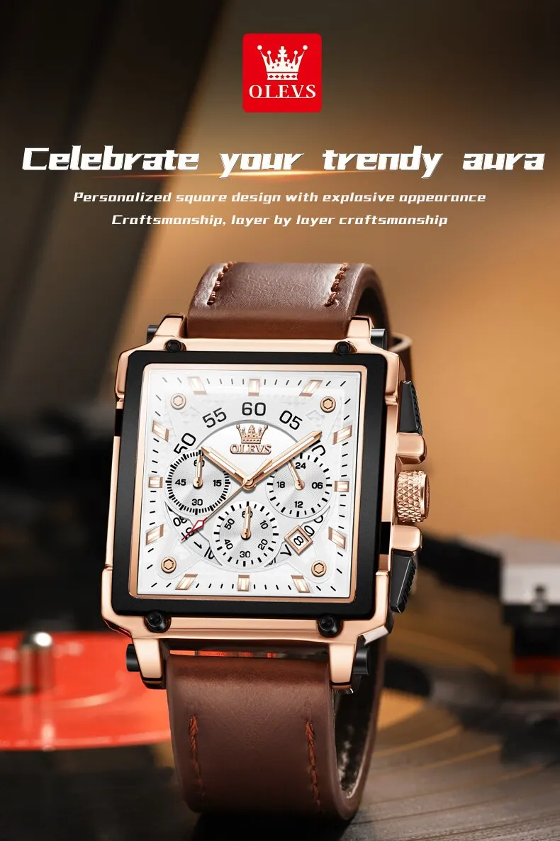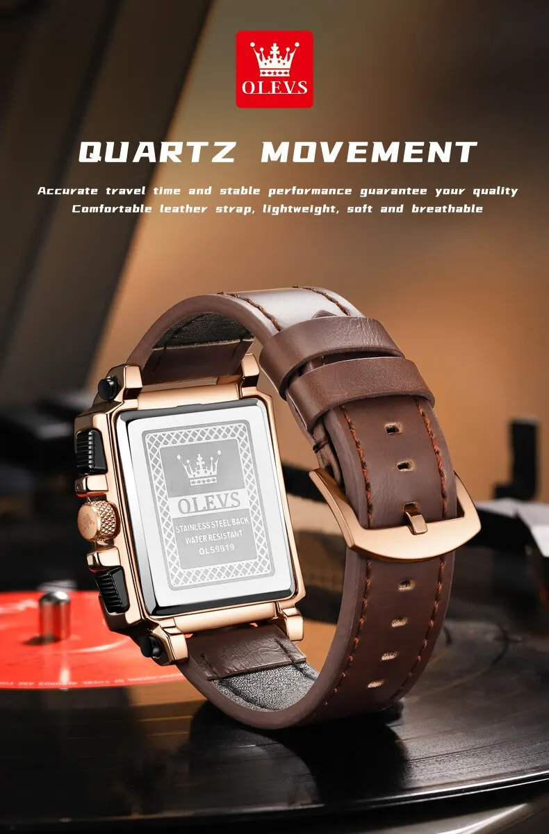 OLEVS Men’s Square Quartz Watch – Leather Strap, Waterproof, Sporty & Elegant Design